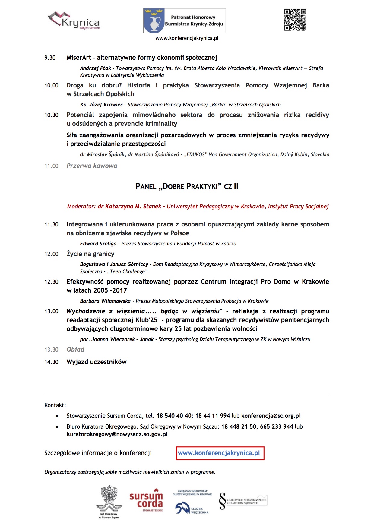 Organizatorzy konferencji „Wsparcie readaptacyjne w prewencji wykluczenia i recydywy”, która odbędzie się w dniach 15-17 listopada br. w Krynicy Zdroju przedstawili program wydarzenia. Po raz kolejny udało się im połączyć w gronie prelegentów znakomitych teoretyków i doświadczonych praktyków. Wsród tych pierwszych znajdą się m.in. prof. Stefan Lelental z Uniwersytetu Łódzkiego, prof. Uniwersytetu Jagielońskiego Barbara Stańdo-Kawecka i prof. Uniwersytetu Pedagogicznego w Krakowie Barbara Nowak. Pierwszego dnia konferencji swoje wystąpienie nt. roli kurateli sądowej w przeciwdziałaniu recydywie i wykluczeniu przedstawi Naczelnik Wydziału Kurateli Departamentu Wykonania Orzeczeń i Probacji p. Henryk Pawlaczyk. Jednym z moderatorów konferencji będzie też p. Grzegorz Kozera – Przewodniczący Krajowej Rady Kuratorów.