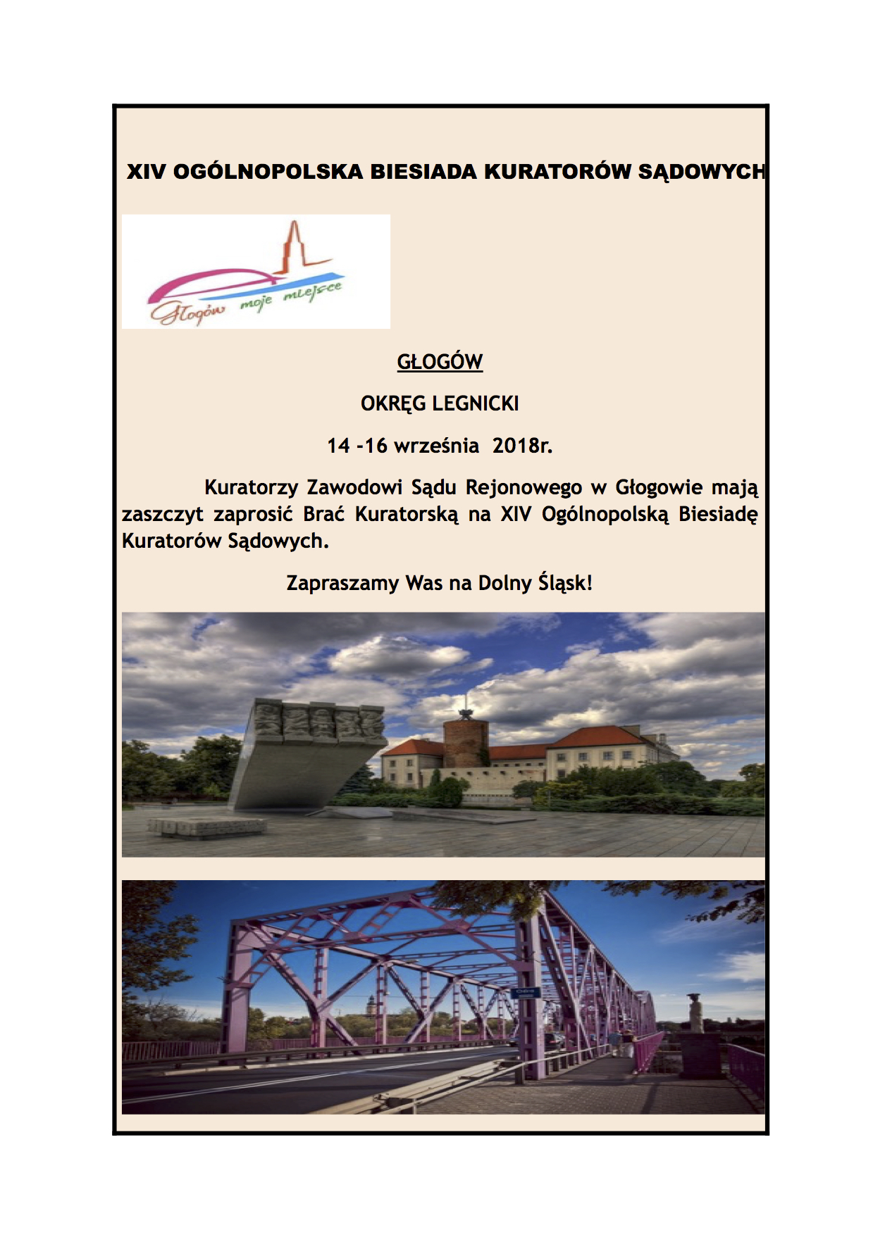 Organizatorzy XIV Ogólnopolskiej Biesiady Kuratorów Sądowych – kuratorzy z Sądu Rejonowego w Głogowie, zaprezentowali program wydarzenia i uruchomili rejestrację uczestników. W ich imieniu gorąco zachęcamy do zapisów.
