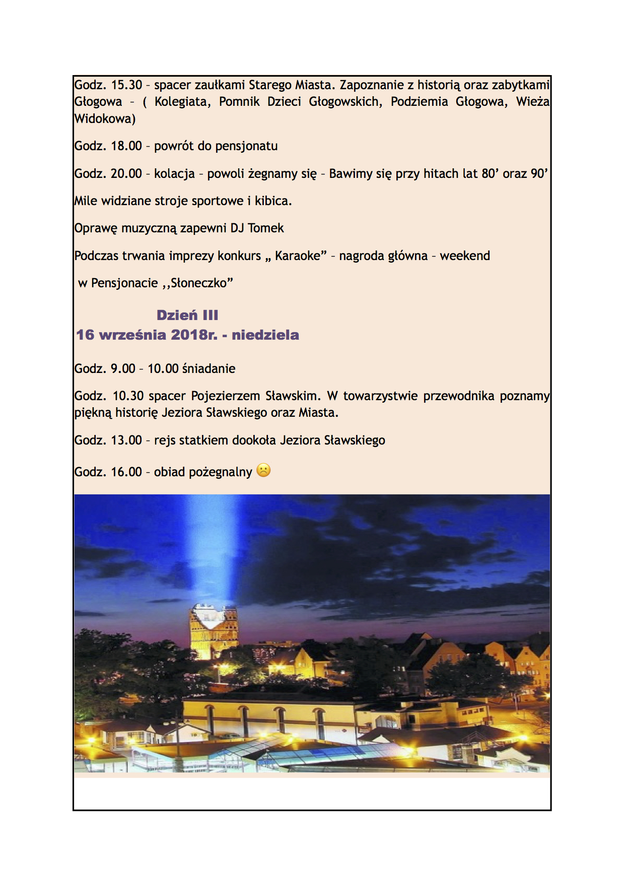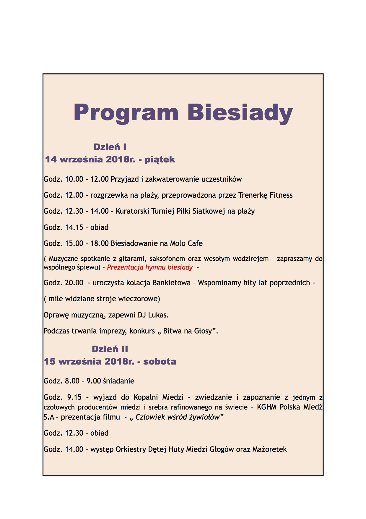 W 2018r. biesiada odbędzie się w dniach 14-16 września w Sławie k. Głogowa, w Pensjonacie Słoneczko”. W programie znalazły się takie atrakcje, jak zwiedzanie kopalni miedzi, spacer po głogowskiej starówce, rejs po jeziorze sławskim, kuratorski turniej piłki siatkowej na plaży. Nie zabraknie także zabawy przy muzyce serwowanej przez DJ-ów.