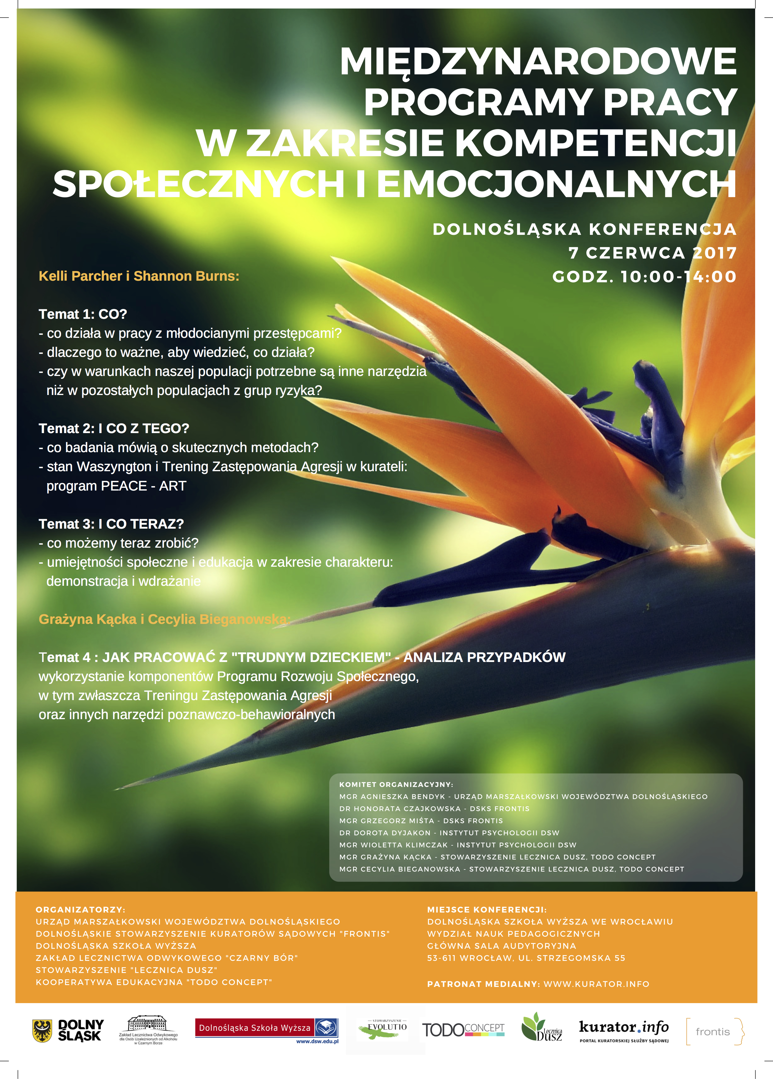 W dniu 7 czerwca w siedzibie Dolnośląskiej Szkoły Wyższej we Wrocławiu odbędzie się konferencja pt. „Międzynarodowe programy pracy w zakresie kompetencji społecznych i emocjonalnych„, której organizatorami są Urząd Marszałkowski Województwa Dolnośląskiego, Kooperatywa Edukacyjna TODO CONCEPT, Dolnośląskie Stowarzyszenie Kuratorów Sądowych FRONTIS, Stowarzyszenie „Lecznica dusz”, DSW i Zakład Lecznictwa Odwykowego „Czarny Bór”. Konferencja spotkała się z bardzo dużym zainteresowaniem. Weźmie w niej udział ponad 300 osób, w tym ok. 100 kuratorów zawodowych z województwa dolnośląskiego. Limit miejsc został wyczerpany w ciągu kilku pierwszych dni rekrutacji. Wśród prelegentów konferencji znajdują się amerykańskie master trenerki programów WSART i Peace4kids – Shanon Burns i Kelli Parcher.