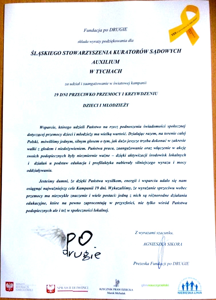 Życzenia z okazji jubileuszu przekazuje Śląskie Stowarzyszenie Kuratorów Sądowych AUXILIUM: