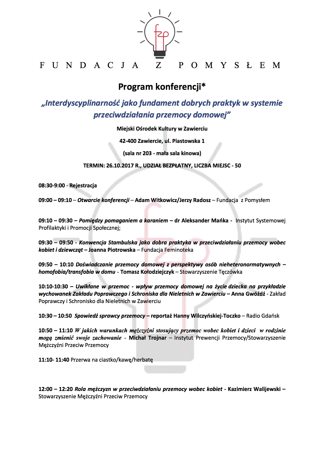 W dniu 26.10.2017r. także w MOK – sala 203 (mała sala kinowa) odbędzie się konferencja pt. „Interdyscyplinarność jako fundament dobrych praktyk w systemie przeciwdziałania przemocy domowej”. Wśród prelegentów będą kuratorzy sądowi, przedstawiciele organizacji pozarządowych oraz lokalnych instytucji zajmujących się przeciwdziałaniem przemocy. W panelu dyskusyjnym weźmie udział Przewodniczący Krajowej Rady Kuratorów – Pan Grzegorz Kozera.