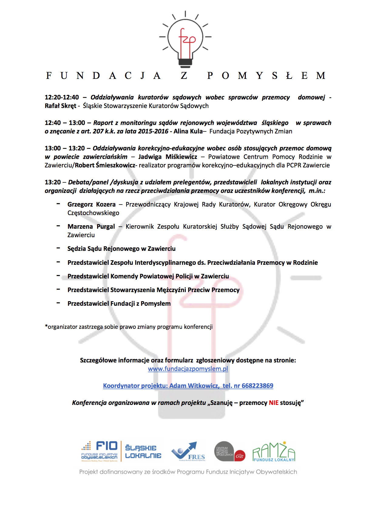 Fundacja z Pomysłem, w której zaangażowani są m.in. kuratorzy sądowi, realizuje projekt dot. przeciwdziałania przemocy domowej „Szanuję – przemocy NIE stosuję”. Projekt składa się z dwóch głównych elementów: