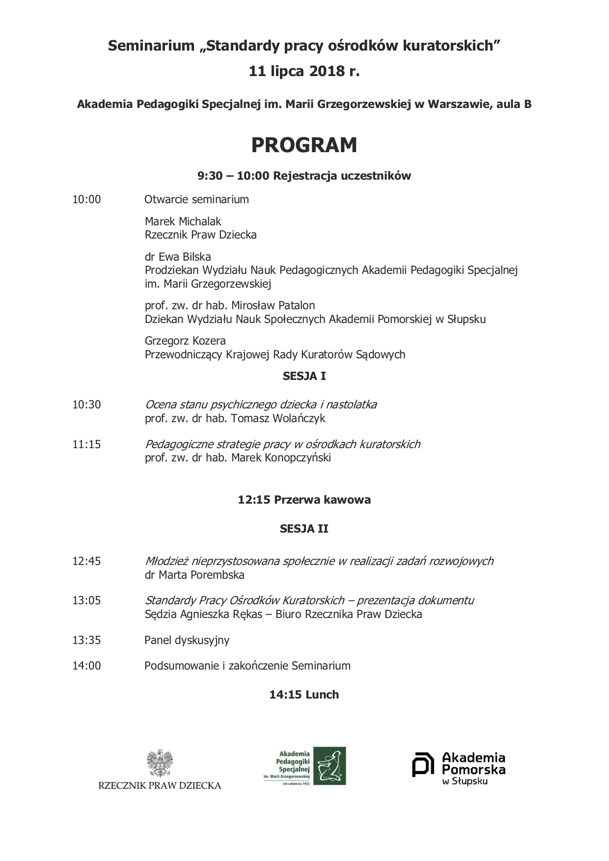 Rzecznik Praw Dziecka Marek Michalak, Rektor Akademii Pedagogiki Specjalnej im. M. Grzegorzewskiej w Warszawie prof. dr hab. Stefan M. Kwiatkowski oraz Dziekan Wydziału Nauk Społecznych Akademii Pomorskiej w Słupsku prof. zw. dr hab. Mirosław Patalon serdecznie zapraszają na :